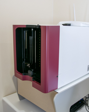 隠れたシミなどをビジュアル化する装置で、肌の治療経過を記録します。